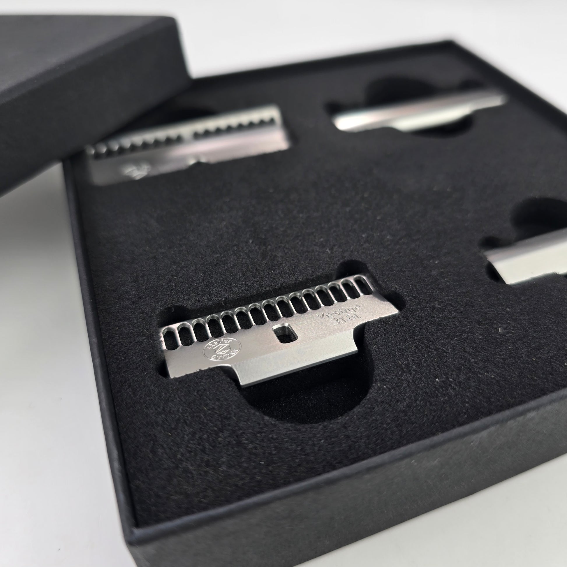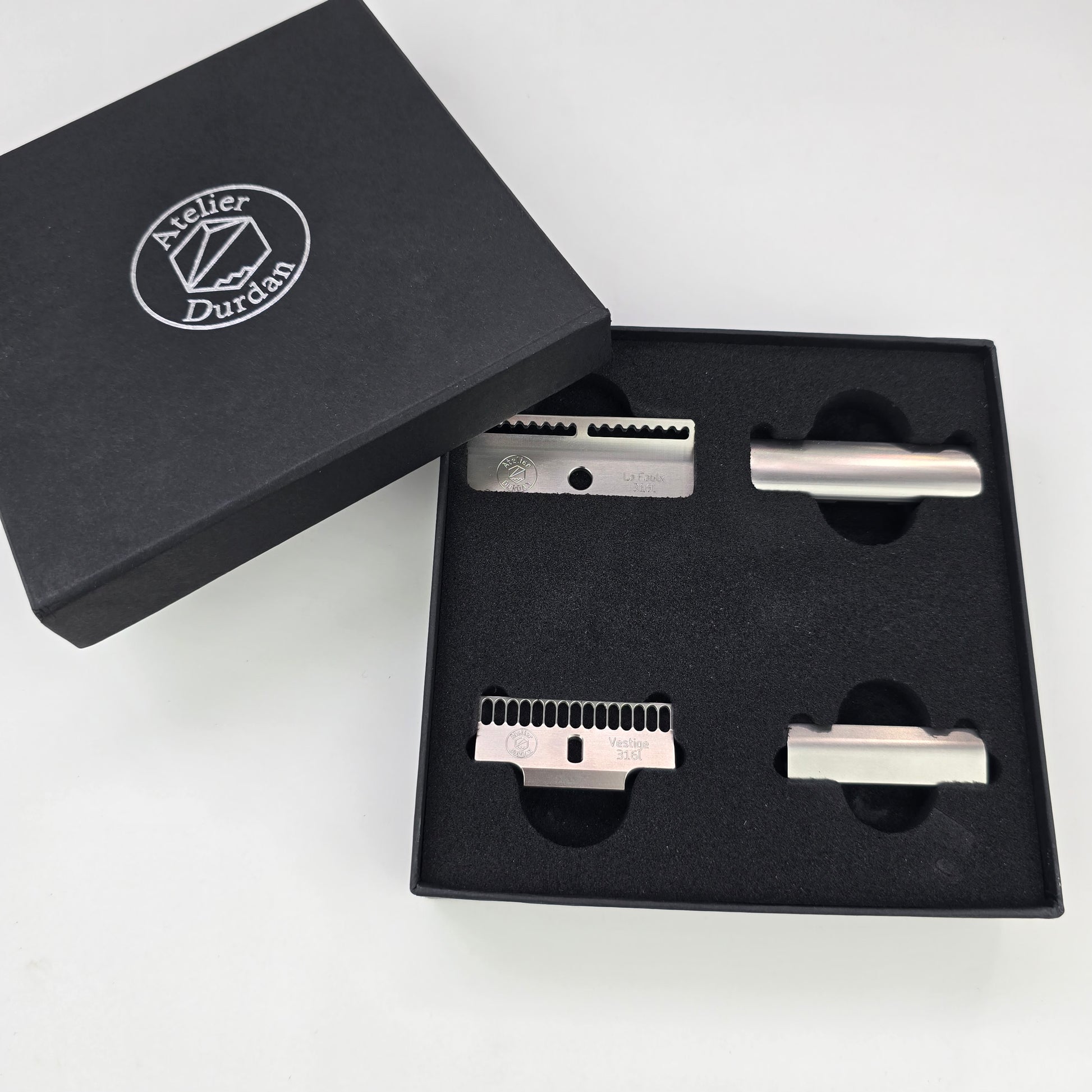 A Vestige head (+++) in machined stainless steel ULTRA+++, providing a more assertive shaving experience for users seeking optimal sharpness and precise control.